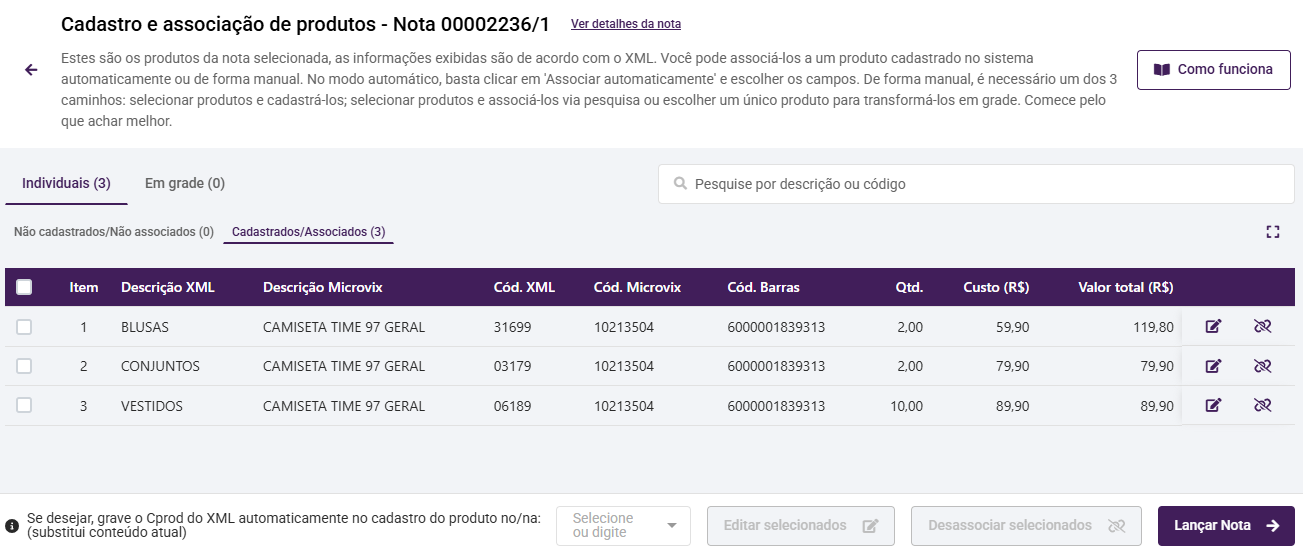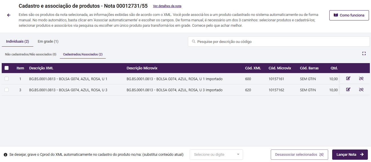 - : ao selecionar alguns itens da nota, este botão será habilitado para desassociar mais de um produto ao mesmo tempo;