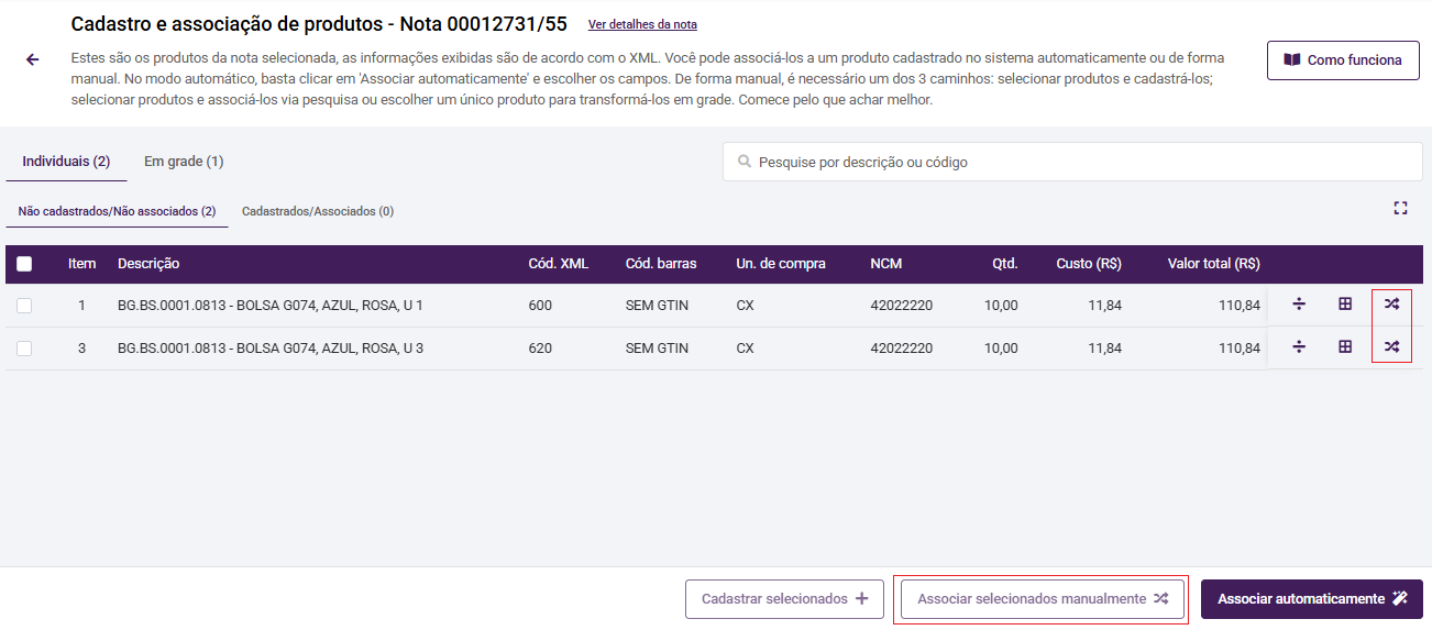 Na associação manual, você poderá fazer a associação individualmente, ao clicar no botão de associação manual de cada produto. A associação manual também poderá ser realizada selecionando os produtos da listagem que deseja associar e clicar em Associar selecionados manualmente.
