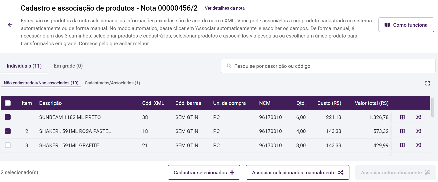Os produtos não cadastrados serão listados na aba Individuais > Não cadastrados/Não associados. Nesta aba, os produtos encontrados são produtos presentes no XML, que contem informações do XML, por isso podem ser identificados como não cadastrados ou não associados. A partir disso você poderá cadastrá-los ou associá-los.