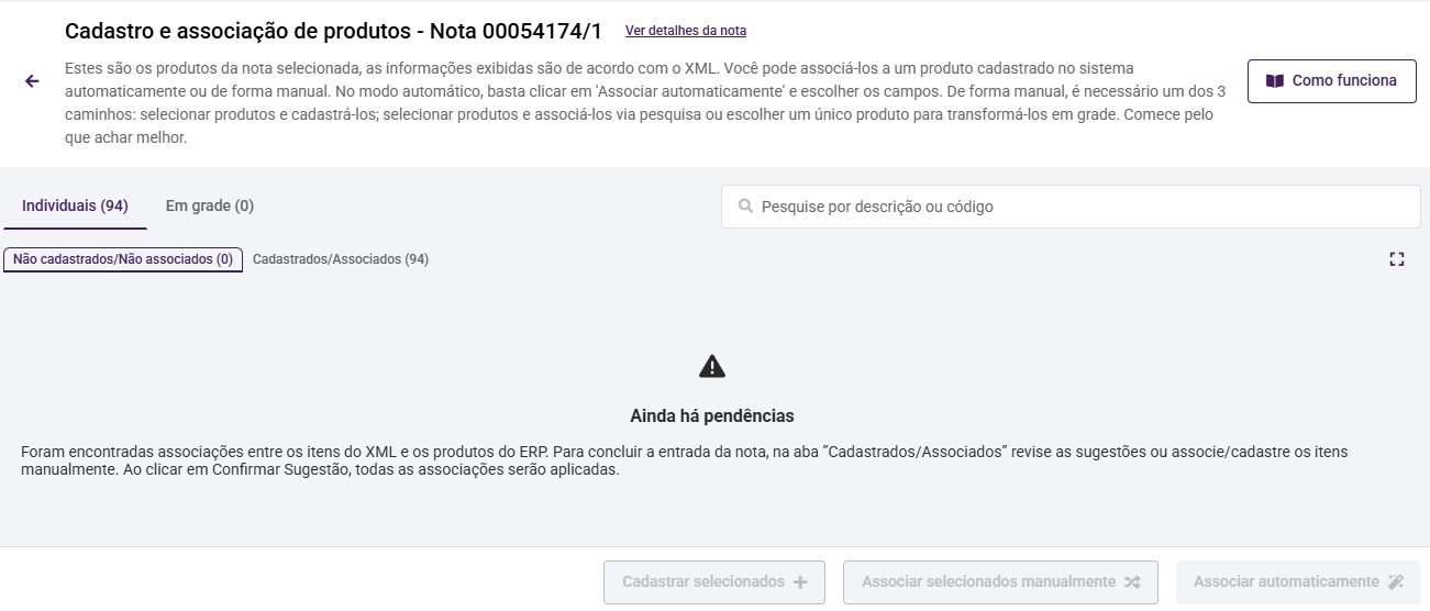 - A associação automática irá realizar a associação de todos os produtos do XML. Por isso, caso algum produto esteja com o checkbox selecionado, o botão de associação automática ficará desabilitado, ficando disponível apenas a função de cadastrar ou associar os produtos selecionados.