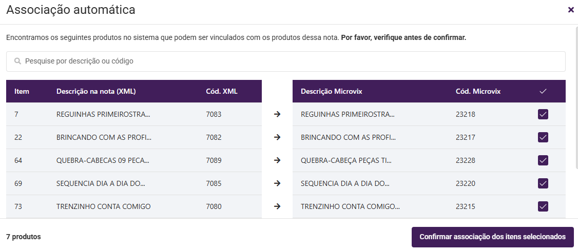 Na tela de confirmação, você poderá conferir os produtos como estão no XML, e os produtos a que serão associados no Microvix.