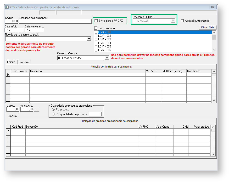 3. Irá habilitar o campo Desconto Propz para selecionar as opções de: