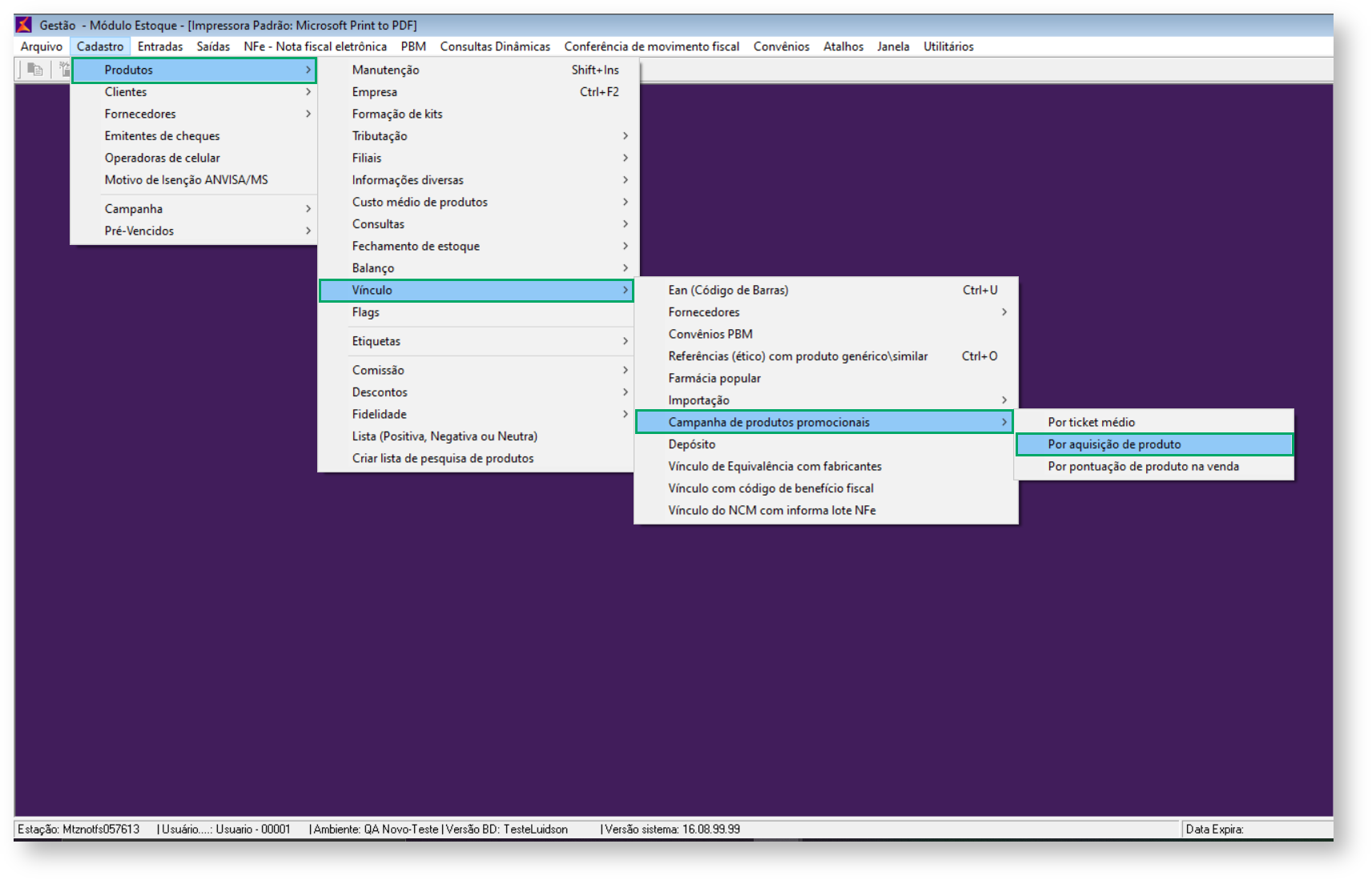 1. Para configurar o Desconto por Campanha utilizando a integração Propz, acesse: Módulo Estoque > Cadastro > Produtos > Vínculo >  Campanha de produtos promocionais > Por aquisição de produto