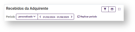 Clicando no ícone é possível replicar o período da tela de Recebidos da adquirente para a Vendas ERP o mesmo se aplica no sentido oposto, dessa forma as duas telas irão refletir o mesmo intervalo de tempo.