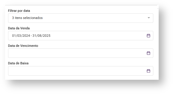 Filtrar por data; Data da Venda, Data de Vencimento e Data da Baixa, podendo selecionar uma ou mais, caso mais de uma seja selecionada abaixo serão habilitados os campos para a inserção de data.