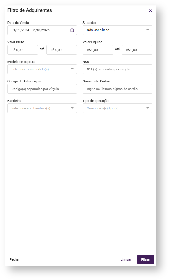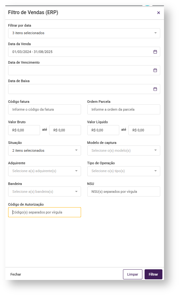 A seleção de Filtros pode ser aplicada tanto na tela de Recebidos da Adquirente quando na Vendas (ERP)