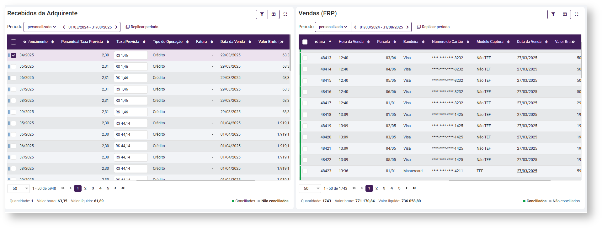 Tela dos Lançamentos do Recebido da Adquirente x Vendas ERP