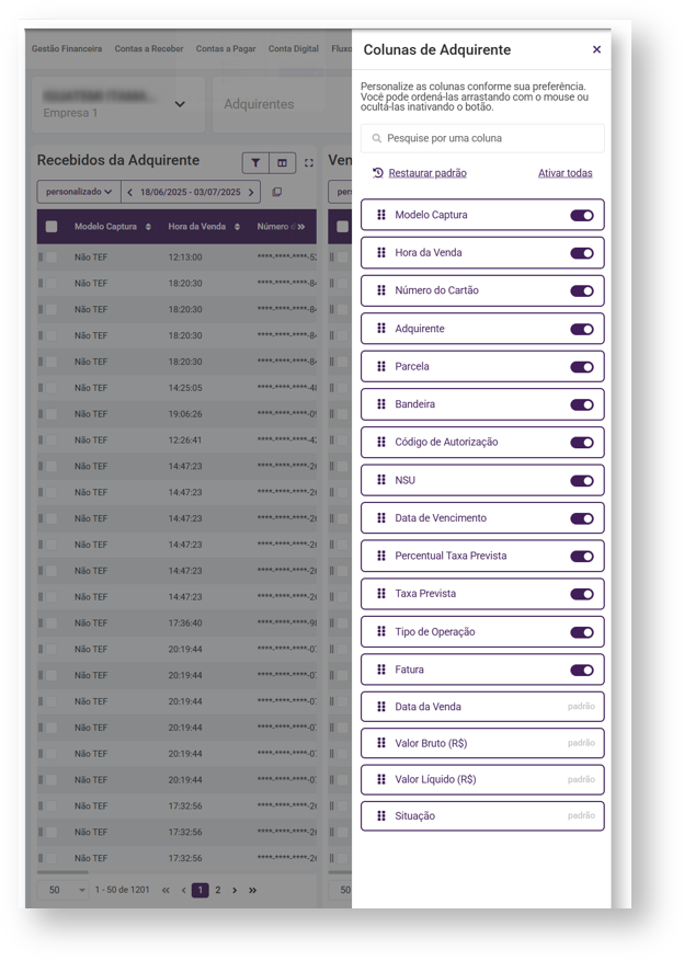 As colunas que são fixas permanecem sendo as mesmas dos Recebidos da Adquirente, são elas: