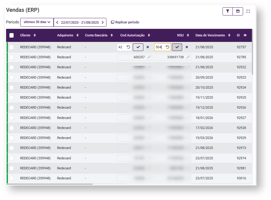 É possível alterar o NSU e Código de autorização de Faturas apenas quando estiverem com o status de Não Conciliadas. É de extrema importância que as seguintes regras sejam seguidas: