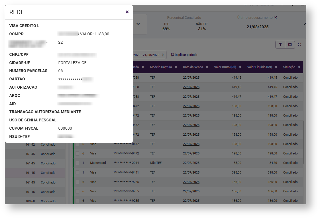 Para visualizar o Comprovante TEF da fatura, é necessário na coluna, Data da Venda, clicar sobre a data e o sistema irá exibir a informação: