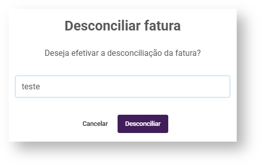 O sistema irá apresentar uma mensagem de confirmação do processo de desconciliação e solicita uma justificativa para que seja gravado.