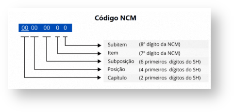 Os seis primeiros dígitos da NCM seguem, por convenção internacional, o SH, e seus dois últimos dígitos são definidos pelo Mercosul. Os códigos da NCM estão distribuídos em 21 Seções e 96 Capítulos. Cada dígito apresenta uma informação sobre uma mercadoria, conforme os níveis abaixo: