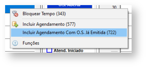 Acessar o Menu: Oficina > Agendamento Oficina selecionar um determinado horário, clicar com o botão direito do mouse e selecionar a opção: Incluir Agendamento Com O.S. Já Emitida (722).