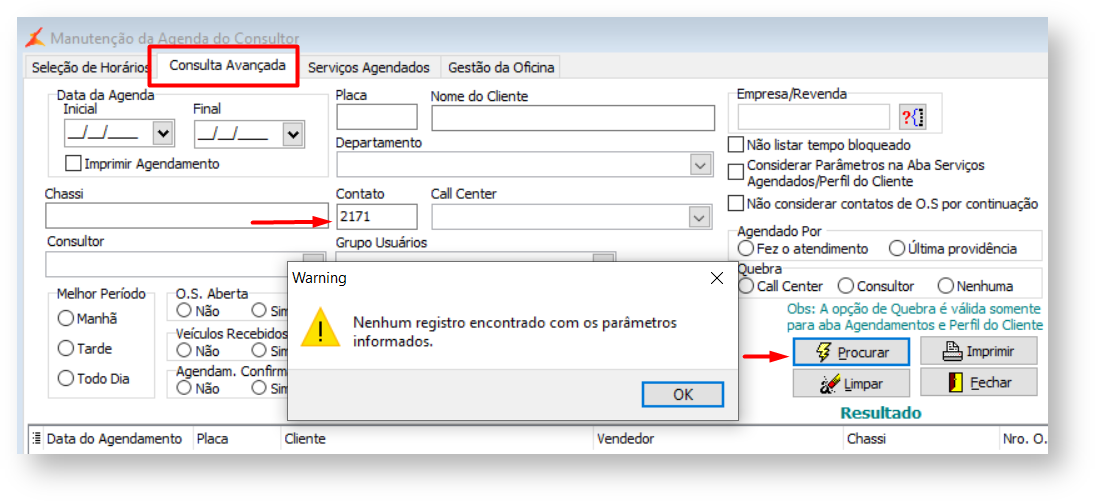 Acessar o Menu: Oficina > Agendamento da Oficina > aba Consulta Avançada. No campo Contato informar 2171 e clicar em Procurar.