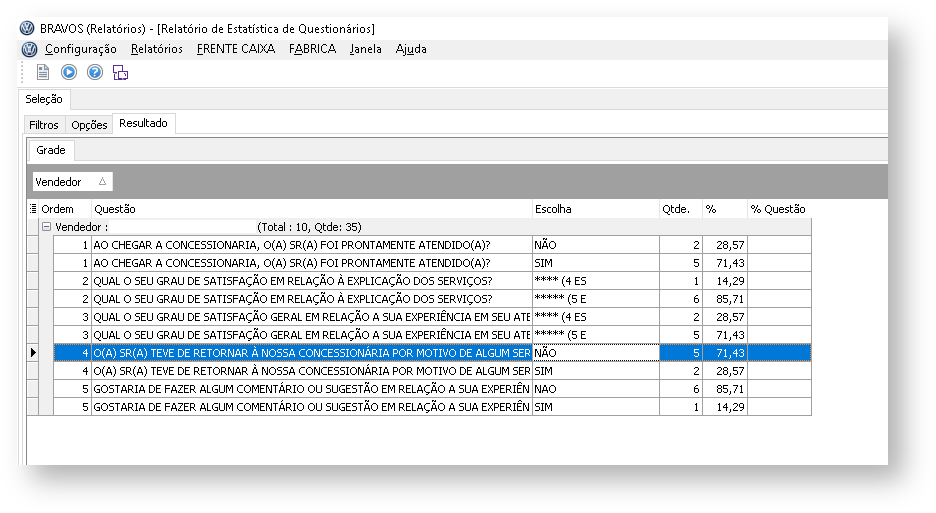 Pelo menu Relatórios > CRM Plus > Estatística de Questionários você consegue analisar um período de tempo podendo analisar a quantidade de resposta para cada pergunta e ainda efetuar divisões por mecânico, consultor, entre outros.