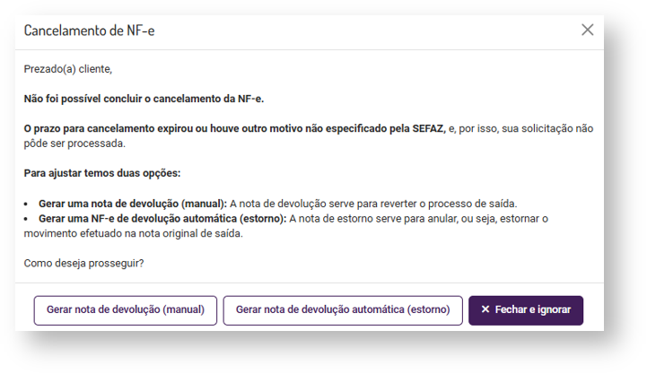 Ao tentar cancelar uma nota com prazo expirado, o sistema não permitirá a ação e irá sugerir a geração automática de uma Nota de Estorno, apresentando as opções:
