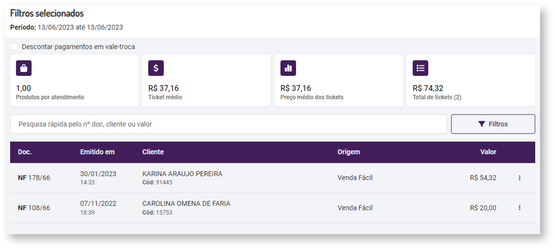 Após definir os campos, clique em Filtrar e a listagem irá atualizar com as vendas que se enquadram nos filtros.