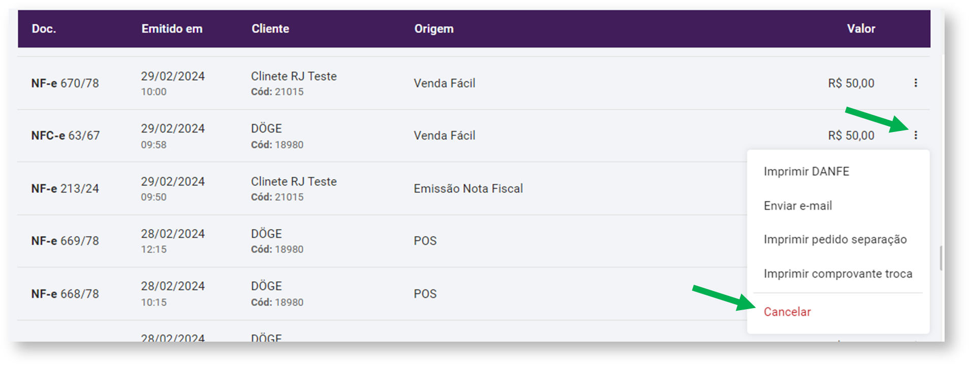 - Doc.: é exibido o número da nota gerada;