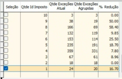 - Tabela com colunas para seleção, quantidade de impostos, quantidade de exceções atuais, quantidade a gerar após o agrupamento e % de redução.