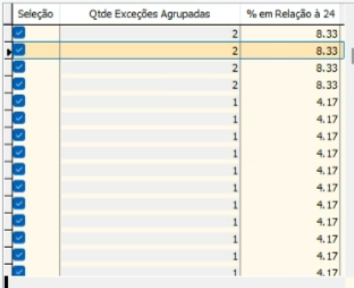- Mostra a relação final das exceções que serão criadas, com as colunas seleção, quantidade de exceções agrupadas e percentual em relação ao total geral de exceções selecionado na tabela anterior.