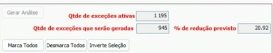 No exemplo abaixo podemos visualizar o total de exceções ativas, além do total de exceções resultante da migração geral e o percentual de redução após realização do processo de migração de todas as exceções. Os botões abaixo (Marca Todos, Desmarca Todos e Inverte Seleção) podem ser utilizados para marcar/desmarcar os grupos de exceções retornados e exibidos na tabela da seção 2 desse documento.