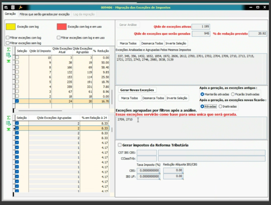 Tela 009406 - Migração das Exceções de Impostos. O objetivo principal desta tela é fornecer uma ferramenta centralizada para analisar, gerar e controlar exceções fiscais de impostos. A funcionalidade permitirá a migração de exceções ativas de um modelo legado para o novo modelo otimizado de filtros, com a meta de automatizar o processo, reduzir drasticamente o volume de exceções manuais e, consequentemente, melhorar a produtividade e a acuracidade na emissão de Notas Fiscais Eletrônicas (NF-e).
