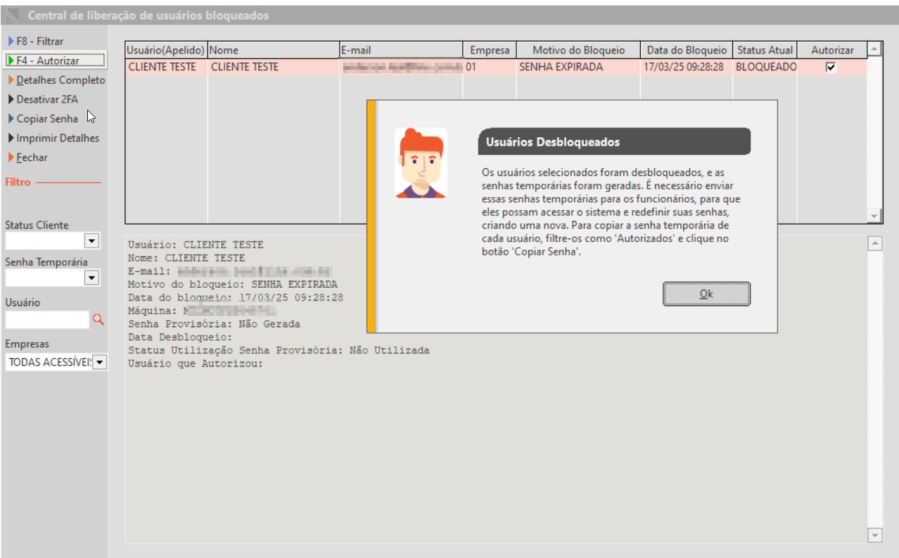 Obs.: A senha provisória não tem prazo de validade, mas será usada apenas uma vez e para o usuário desbloqueado.