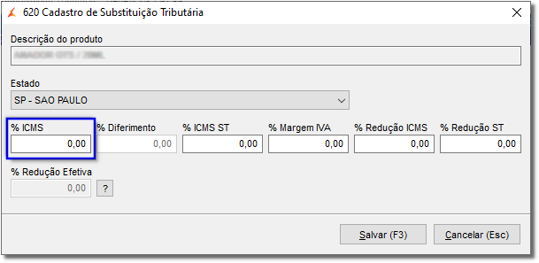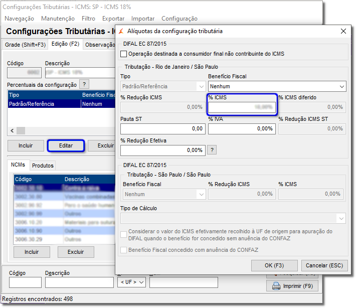 E por fim, deve ser atualizado a alíquota aos respectivos produtos na tela de configurações tributárias acessando através do menu Cadastros > Fiscais > Configurações Tributárias > ICMS no Campo “% ICMS”.