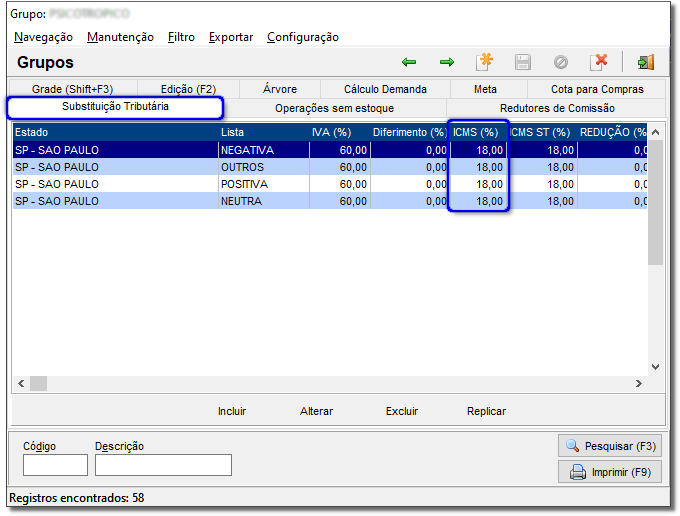 cliques sobre o nome do grupo e vá para a aba "Substituição Tributária" e atualize no campo "%ICMS" a alíquota desejada.