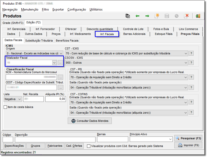Logo após cadastrar a nova alíquota acesse o cadastro de produtos através do menu Cadastros > Produtos > Produtos > Inf. Fiscais e atualize o campo “Totalizador fiscal” de acordo com o que foi cadastrado na Figura 03 acima.